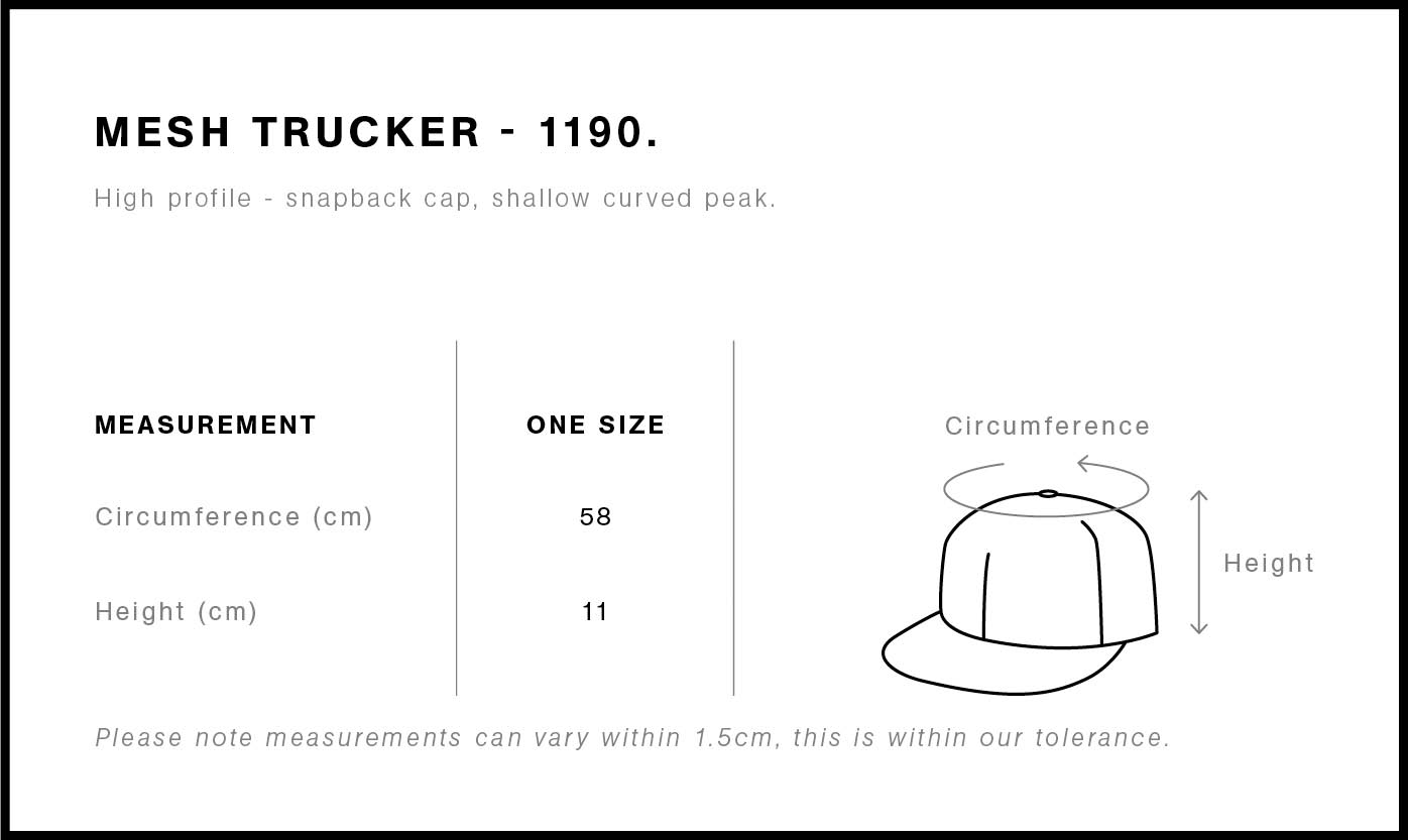 Fabric: Mid weight, 60% cotton / 40% recycled polyester front and peak, 100% recycled polyester mesh back